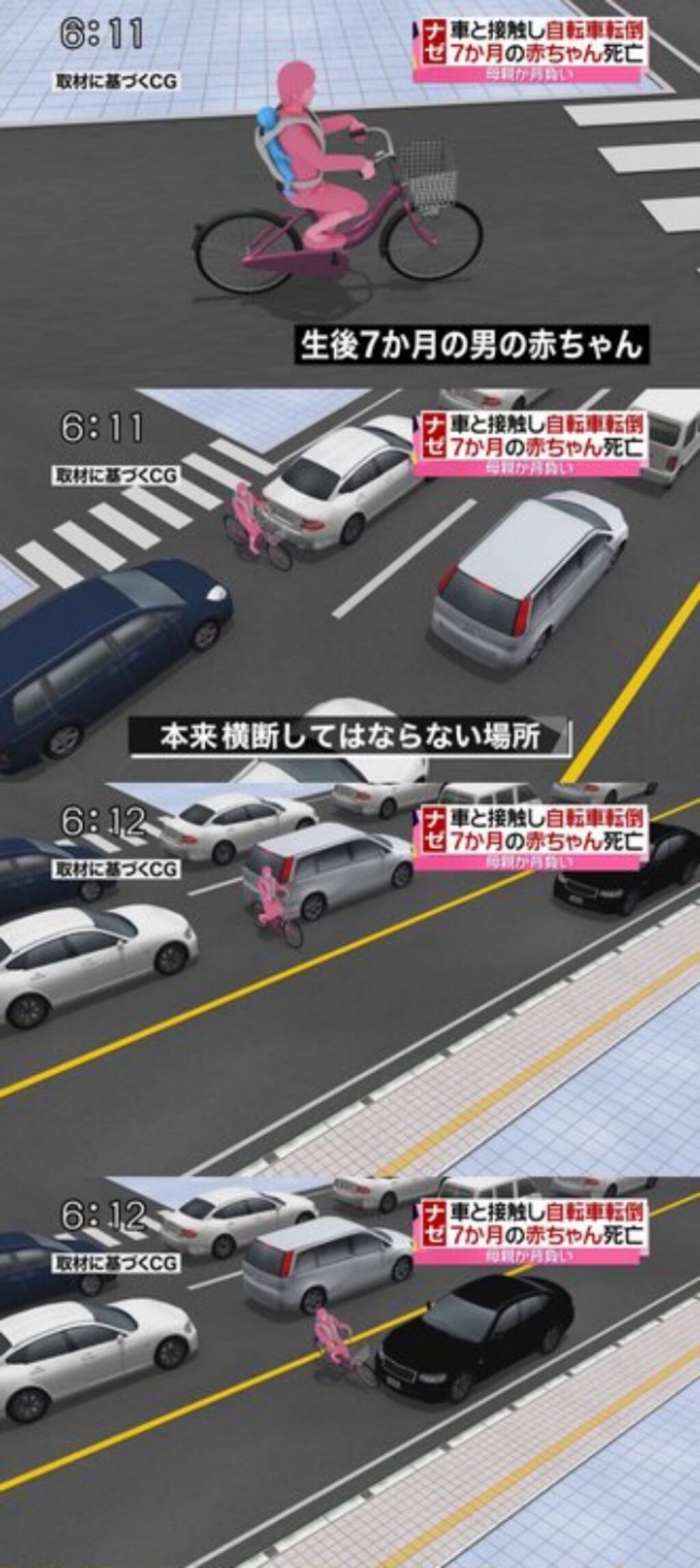 2つ目はドライブレコーダーの映像から認定した児童側の運転の状況だ。自転車は歩道上を徐行せずに走行し、児童は前方の信号が赤であることを確認しなかった。